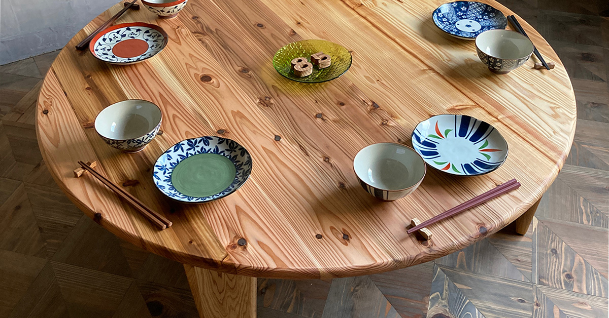 最初、少し心配だったウレタン塗装も私の知るテカテカツヤツヤな感じとはまったく違っていました。ワイルドな木目の感じも平凡な我が家のインテリアでも合うかどうか心配でしたが、とても素敵でした!天板の縁や裏の井の部分の丸い感じもあたたかみがあっていいですね〜!